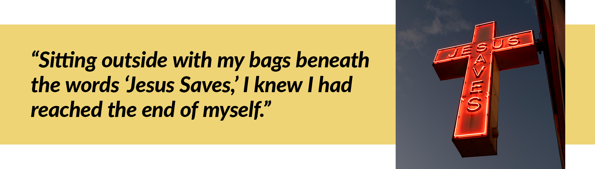 “I returned to Chicago and spent two years isolated and afraid, unable to break free from addiction. When I was forced to leave the place I was staying, I was driven to Pacific Garden Mission. Sitting outside with my bags beneath the words “Jesus Saves,” I knew I had reached the end of myself. I had driven past that sign countless times and never believed it, but this time was different.